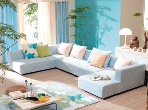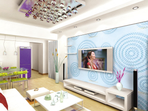 現(xiàn)正值春夏交接之際,人們的心情都比較容易煩躁。過(guò)艷或過(guò)重的顏色都會(huì)給人的視覺(jué)帶來(lái)很大的沖擊感,從而加重內(nèi)心的煩躁感。家中的顏色最佳為乳白色、象牙色、白色三種顏色,因?yàn)檫@種色系與人的視覺(jué)神經(jīng)最適合。所以在這個(gè)婚房設(shè)計(jì)中我采用了白色作為主色調(diào),而背景墻選用了藍(lán)色的壁紙,因?yàn)樗{(lán)色是色彩中比較沉靜的顏色,是一種令人心境暢快的顏色。同時(shí)它還象征著永恒與深邃。背景墻的L形造型與客廳中的L形沙發(fā)交相呼應(yīng),加上水晶燈的造型給人營(yíng)造出一種時(shí)尚的感覺(jué)。在餐廳的造型用色上,選用了藍(lán)色的互補(bǔ)色橙色,使整個(gè)客廳的色調(diào)達(dá)到和諧。