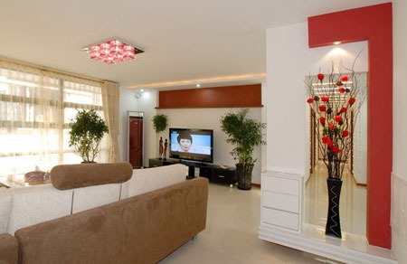 客廳是家人休閑、親朋好友相聚的場所,而目前大眾家庭娛樂的手段主要是看電視、看VCD、唱卡拉OK等,于是,客廳的電視背景墻成了最吸引人們眼球的地方。事實上,在家裝設(shè)計中,電視背景墻早已成了設(shè)計的“焦點”,也是體現(xiàn)主人個性化的一個特殊空間。