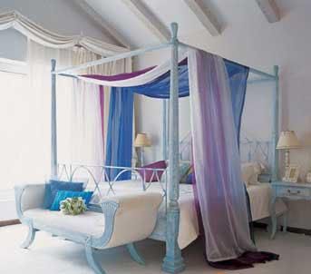 現(xiàn)代的都市人,生活在鋼筋水泥之中。每天面對(duì)汽車,電腦,還有緊張的工作與應(yīng)酬!心里得不到片刻的寧?kù)o。人們向往那種藍(lán)天,碧海的環(huán)境,憧憬自由,浪漫與輕松的生活方式。這正是地中海風(fēng)格的裝潢,像這個(gè)臥室的裝潢,墻壁選擇浪漫的藍(lán)色,讓人感覺走進(jìn)了大自然,心情也格外的舒暢。