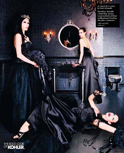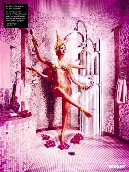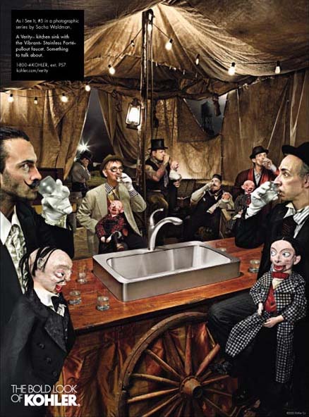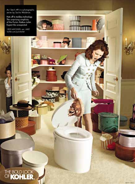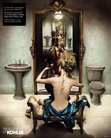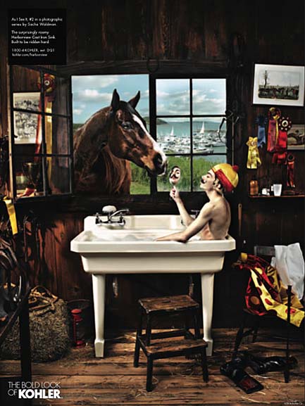 初看Kohler的這幾組雜志廣告,首先是被畫(huà)面豐富的故事性所吸引,然后才注意到產(chǎn)品——這與一般廣告突出產(chǎn)品的做法極為不同。同時(shí),與一般強(qiáng)調(diào)產(chǎn)品清潔干凈質(zhì)感的表現(xiàn)方法不同,幾位出色的攝影師戲劇性甚至有點(diǎn)超現(xiàn)實(shí)的表現(xiàn)手法也頗讓我吃驚。