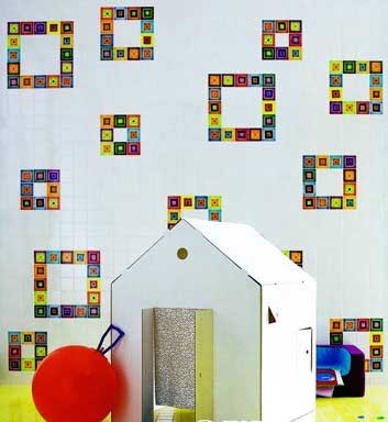 小塊瓷磚在拼貼時有更高的自由度。一片圖案鮮艷的瓷磚單獨看起來很漂亮,但鋪滿一面墻的話,往往眼花繚亂。以白色為底,花色磚為裝飾,拼貼出各種圖形的方法,可避免這種雜亂無章的現(xiàn)象。