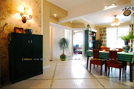 廚房門口便是餐廳,鋪上綠色條紋桌布,再配上藤藤制餐椅和花瓶,營(yíng)造了清爽舒適的環(huán)境。墻壁鋪貼了鏡子馬賽克,人在家中的活動(dòng)都能在鏡中顯現(xiàn),使居室有動(dòng)感和生機(jī)。