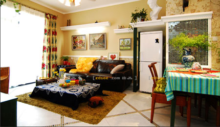 概要: 玄關(guān)處僅有一個(gè)多平方米,在這樣一塊方之地,將它利用得非常到位。右手邊設(shè)置了到頂?shù)谋跈?,上下部分可收納大量雜物;正對(duì)面有一個(gè)小鞋柜,上部運(yùn)用裂紋玻璃將廚房封閉起來,既保留了居家的隱蔽性,又為進(jìn)門玄關(guān)和廚房增添了采光?! 】蛷d中設(shè)計(jì)了幾段眉檐,它們并沒有連綿不斷,而是錯(cuò)落有致的斷開,制造了一種殘?jiān)珨啾诘囊饩?。沙發(fā)旁的冰箱上方設(shè)計(jì)成涼亭狀,恰似戶外花園的景致。