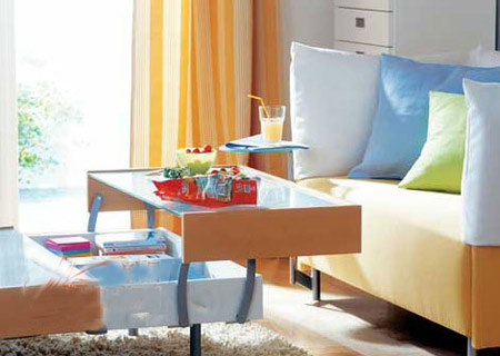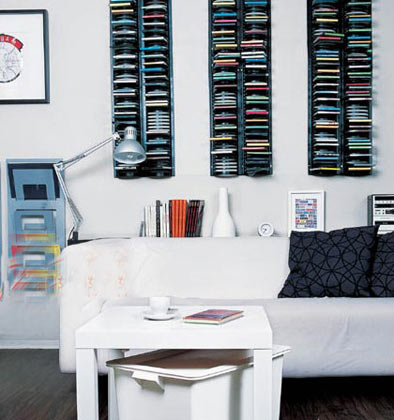當(dāng)?shù)孛嫔弦呀?jīng)沒有多余空間的時候,我們可以開始打墻面的主意了,沙發(fā)后面的墻壁可以好 好的利用起來。放置豎款CD架,既可以大量地收納CD,也可以作為一種漂亮的展示,同時還可以利用沙發(fā)扶手 旁邊的空白墻壁,在這個較低的位置上掛置一個報刊架,沙發(fā)前的茶幾下也有空位,放置一個儲物箱,方便又 實用