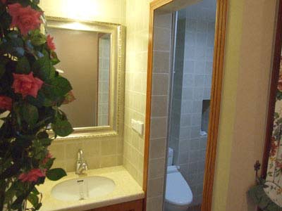 看清楚了,原來(lái)這里面是一個(gè)衛(wèi)生間,據(jù)“鄉(xiāng)村之戀”講,原來(lái)這里是一面墻,光線和結(jié)構(gòu)都非常不好,于是充分發(fā)揮他的聰明才智,又是請(qǐng)教師傅,又是上網(wǎng)查資料,方案做了一個(gè)又一個(gè),最后決定把墻做成了窗欞的樣子,這樣既好看又光線通透,這實(shí)在是太有創(chuàng)意了,廣大正奮戰(zhàn)的裝修一線的網(wǎng)友不妨偷學(xué)這一招,絕對(duì)有意想不到的效果。當(dāng)然,這也是鄉(xiāng)村之戀裝得最滿意的,還叫我們多拍一點(diǎn)照片呢!