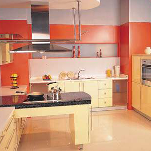 通常,能夠表現(xiàn)出干凈的色相主要有灰度較小、明度較高的色彩,如白、乳白、淡黃等,而能夠刺激食欲的色彩主要是與好吃食品較接近、或在日常生活中能夠強烈刺激食欲的色彩,如橙紅、橙黃、棕褐等。能夠使人愉悅的色彩就復雜多了,不同的人、不同的生活環(huán)境對色彩的喜好有很大的變化,但并不是所有的人都在廚房操作。