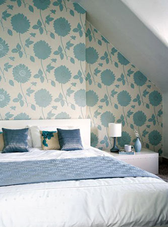 白底淺藍(lán)色向日葵圖案的Crowson墻紙賞心悅目。床架和儲藏格均來自宜家,被子和床罩自然也是清新的淡藍(lán)色。床頭藍(lán)色Lurex小靠墊和Pistachio藍(lán)花小靠墊隨意擺放,窗邊小桌上,藍(lán)色底座白色燈罩的Marlene臺燈與Matalan花瓶繼續(xù)將藍(lán)色進(jìn)行到底,藍(lán)色成為整個房間的主宰,既淡雅又充滿情趣。