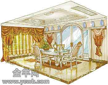 客廳客廳是這套房的核心,中央調(diào)空之后,頂仍很高,顯得很氣派。房主挑選的是布藝沙發(fā),十分簡單。為了將客廳做得豐富一點,我們重點在墻面上做了一些法國風(fēng)味的花紋和線條,而天花和地面則簡單處理,僅僅在天花上加了一些弧線,地面用的是大理石,以突出墻面的層次感。