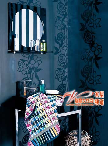 優(yōu)雅的復(fù)古花紋就在盥洗區(qū)的墻面上,雖然也是黑色的,亮光效果卻能在亞光底色上脫穎而出,為黑白基調(diào)的衛(wèi)浴空間增添了一份優(yōu)雅的味道。彩條圖案的毛巾也不可缺少,因?yàn)樗坏切l(wèi)浴生活的必需品,同時(shí)又不失裝飾性,為視覺增添欣賞點(diǎn)。
