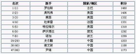 本周,男子110米欄前十位基本沒有大的變化,唯一的變化就是上期排名第9的捷克選手斯沃博達(dá)上升的第6位,上期6到8名依次下滑一位。而名將羅伯斯以1460分穩(wěn)坐頭把交椅,美國(guó)選手奧利弗和佩恩緊隨其后,分列二、三位;法國(guó)選手杜庫(kù)雷盡管還是排名第四,但是和佩恩只差1分,美國(guó)選手特拉梅爾排名第五。