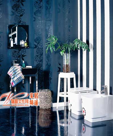 在配有淋浴和浴缸的衛(wèi)浴間里,用黑白兩色小馬賽克設(shè)計(jì)地面,拼成黑色和白色相間的水波紋理,整間浴室就化身為水上世界,浴缸、潔具、家具都好像漂浮在水面上,而墻壁上的花紋彩繪,令衛(wèi)浴生活變得新奇又浪漫。