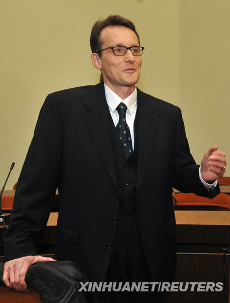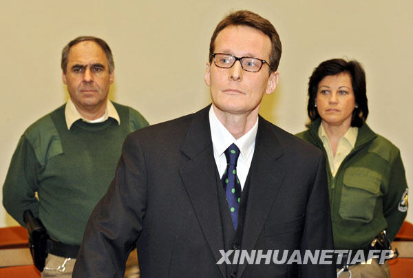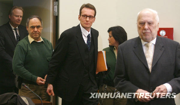 3月9日,瑞士男子黑爾格·斯加爾比(中)在律師的陪同下來到德國(guó)慕尼黑的法庭接受審判。新華社/路透