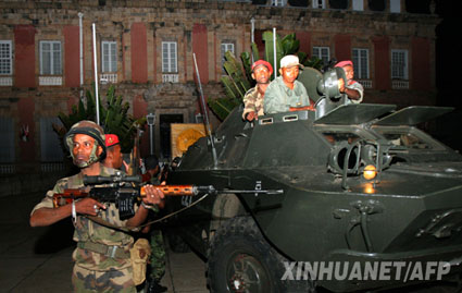 當(dāng)?shù)貢r間16日晚約7時,武裝部隊向位于市中心一座山上的總統(tǒng)府發(fā)起攻擊,首先發(fā)射了兩枚火箭彈,并鳴槍警告總統(tǒng)府守衛(wèi)部隊,隨后用擴音器朝守衛(wèi)部隊喊話,要求他們投降。早已在總統(tǒng)府附近待命的兩輛裝甲車隨即開了過來,撞開了總統(tǒng)府的鐵柵欄門。