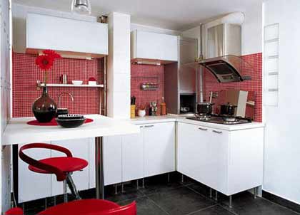 圓形的紅色桌墊與吧凳,與直線條的白色櫥柜相互混搭。