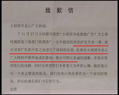 就在記者對(duì)玖玖理療褲的虛假廣告進(jìn)行調(diào)查時(shí),河南開封大相國寺向記者出具了一份玖玖理療褲河南開封經(jīng)銷商,寫給大相國寺的一封致歉信,承認(rèn)自己假冒僧人的錯(cuò)誤行為,從此廣告中來自大相國寺的高僧空智,就如同人間蒸發(fā),再也沒有出現(xiàn)過,取而代之的是佛教禪宗第36代傳人,但卻有著相同的名字和面孔——空智。
