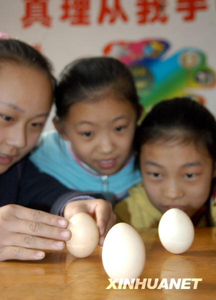 3月20日,南京市實驗幼兒園的老師在幫助小朋友立蛋。