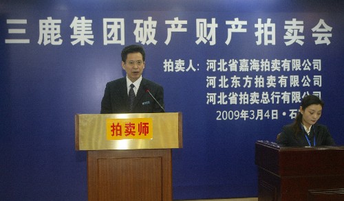 3月4日 “三鹿集團(tuán)”破產(chǎn)首次拍賣會(huì):三元以總價(jià)61650萬(wàn)元成功競(jìng)拍 3月4日,拍賣師主持“三鹿集團(tuán)”破產(chǎn)首次拍賣會(huì)。當(dāng)天上午,石家莊三鹿集團(tuán)股份有限公司(“三鹿集團(tuán)”)破產(chǎn)首次拍賣會(huì)在河北省石家莊市中級(jí)人民法院審判庭舉行。最終,北京三元集團(tuán)有限責(zé)任公司與河北三元食品有限公司組成的聯(lián)合競(jìng)拍體以61650萬(wàn)元人民幣的價(jià)格競(jìng)拍成功。 新華社發(fā)(丁立新 攝)