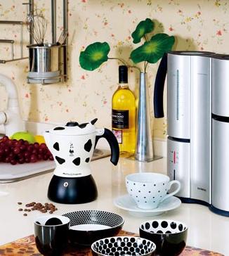 黑白點(diǎn)圖案一直是時(shí)尚界的寵兒,將它運(yùn)用到廚房的餐具上也一樣經(jīng)典。杯碗內(nèi)的黑白點(diǎn)排列或緊密或稀疏,圓點(diǎn)或大或小,微妙的變化就可以組合出不同的圖案造型,帶給視覺小小的驚喜,放置它們的豹紋圖案托盤也將時(shí)尚氣質(zhì)再次提升。旁邊咖啡壺上不規(guī)則的黑白點(diǎn)圖案打破了一般小家電的單調(diào)色彩,將咖啡壺裝點(diǎn)得十分別致,營(yíng)造出活潑獨(dú)特的氣質(zhì)。