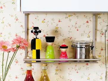 味黃綠色的塑料水杯內(nèi)的白色杯壁運(yùn)用了鏤空雕花的手法,花朵造型大方簡(jiǎn)單,充滿單純自然的氣質(zhì),旁邊的紅色塑料果盤鮮艷喜氣,盤沿比較寬,上面圍繞著一圈鏤空的抽象人形圖案,增加了果盤的時(shí)尚性。金屬材質(zhì)的多用架有很強(qiáng)的實(shí)用價(jià)值,底部同樣裝飾著鏤空人形圖案,將泛著柔和光澤的不銹鋼多用架映襯得更加精致,為廚房的操作空間增添新奇趣味。