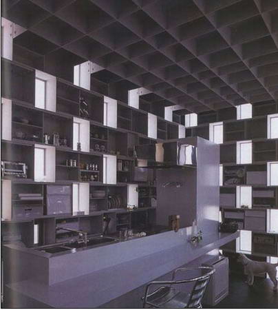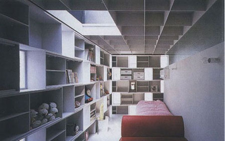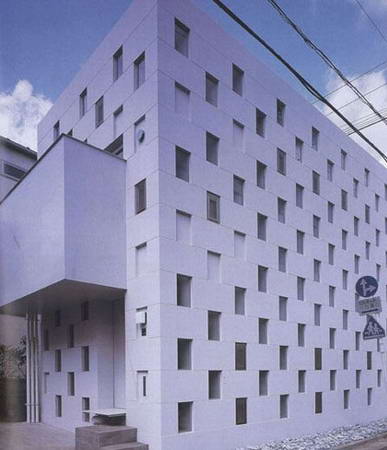 這座面積僅有85平方米的四層樓住宅坐落在東京郊區(qū)一個安靜的角落里。白色的鋼板表皮上布滿了玻璃窗形成的規(guī)則圖案,從而使它的尺度變得難以捉摸。建筑師將其發(fā)明的這種建造體系稱為“空的石工”,因為它是用方盒子一樣的構(gòu)件組成的。