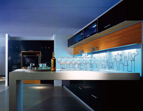 冷峻的黑色櫥柜,工業(yè)設(shè)計(jì)感極強(qiáng)的白色吧臺(tái),現(xiàn)代化的視聽組合,暗藏彩燈的壁柜,甚至還有大做文章的墻壁,以不銹鋼擱板為界,上面是原始?xì)庀⒌哪荆旅媸蔷€條簡(jiǎn)潔的圖。如此分明的方式,組合著這些傳統(tǒng)和非傳統(tǒng)的事物,廚房陡然間變成各種新奇事物的展示臺(tái)。