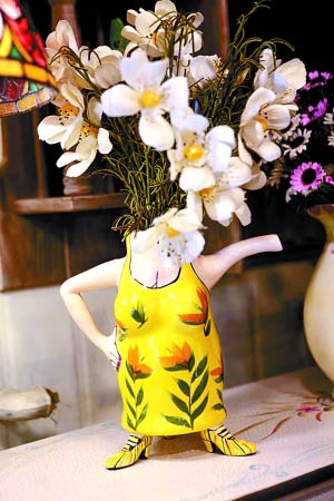 著長裙的婦女明顯發(fā)福,明黃色的裙子讓身材更加“凹凸”,而一手叉腰,一手舉起的姿勢仿佛在表現(xiàn)著什么。這個可愛的“女人”頭上就是插花口,就算放入一束簡單的花,也能給觀者帶來不錯的心情。