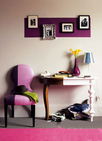 對(duì)于原本是米白色和木色系為主的玄關(guān)處,可以在墻面、家具和地面上直接加入漿果色系的顏色,就能馬上獲得全新視覺(jué)效果。邊桌上紫色的花瓶必不可少,家居色彩運(yùn)用的最高境界就是在所有擺設(shè)之間找到平衡。