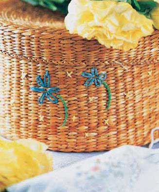 用藤條編織的收納籃子,紋路清晰明了,并且有空隙,所以很容易在上面繡上各種圖案。籃子上的花朵和細(xì)枝,以及細(xì)密的十字形點(diǎn)綴圖案繡法都十分簡單易行。如果家中有這種編織方式的籃子,可以嘗試用這種方法裝飾一下。