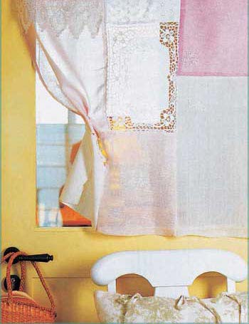 制作簾子時最好選擇稍薄的材料,準(zhǔn)備大小不同的幾塊布料,分別繡上需要的圖案。最后,用針線將布料縫綴成為簾子就可以了。如果覺得刺繡有點(diǎn)困難的話,可以利用已經(jīng)繡有圖案的手帕,也不失為一種好方法。