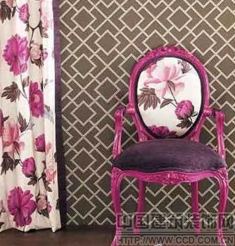 咖啡色的菱形壁紙圖案很有空間感,但較為沉悶,所以窗簾和家具的顏色就要出挑一些。