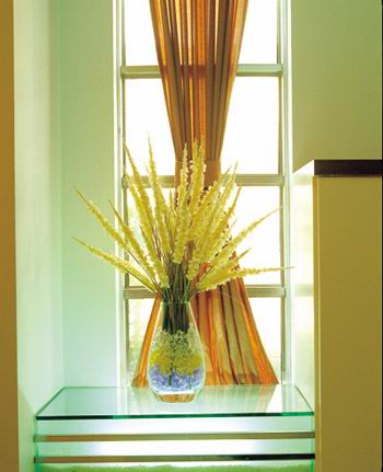 把原本細(xì)長(zhǎng)的窗戶加以延伸,運(yùn)用玻璃、鋼條兩種似近非近、張揚(yáng)個(gè)性的材質(zhì)層層疊加,組成晶瑩剔透的小裝飾臺(tái)。讓陽(yáng)光透過玻璃的棱角放射出閃耀的光芒,照射在圓潤(rùn)的玻璃花瓶上,讓藍(lán)、黃、白色的水晶球一捧原野無味的干草花,一切就像一個(gè)默默無聞的傾聽者,把業(yè)主的情致、個(gè)性傳達(dá)得淋漓盡致,而人的心情也會(huì)在這個(gè)小空間里頓生幾分愉悅。