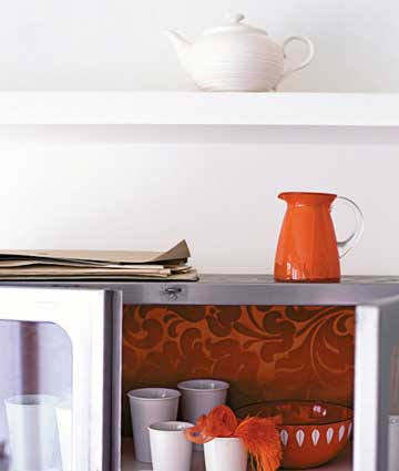 用鮮亮圖案的材質(zhì)或墻紙來重新裝飾櫥柜,這是一個(gè)簡單易行的制造沖擊力的方法。用當(dāng)代風(fēng)格的墻紙、壁布,甚至是印刷品都可以,將它們貼在櫥柜里面、柜門上或者干脆就貼在外面。但最好和整個(gè)空間的風(fēng)格和色調(diào)相協(xié)調(diào)。
