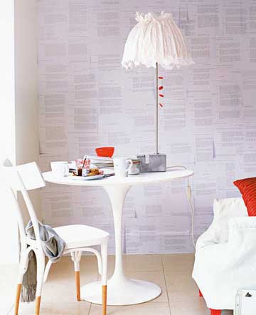 用復(fù)印的文稿裝飾個(gè)性墻面。將墻面涂滿膠水,然后粘上文稿。不要過于擔(dān)心是否整齊,不規(guī)則更增添其吸引力,其他的小工藝還包括用彩紙包裹椅子腿,或者在粉刷家具時(shí),故意留下一部分,以及將臺(tái)燈的拉繩點(diǎn)綴上紐扣,而選擇紅色靠包可能是最簡單易行的調(diào)色方法了。