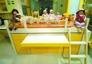記者在東方家園精品家具廣場一家兒童家具店看到一款帶有收納柜的嵌入式雙層兒童床,上層為睡眠區(qū),下層為收納區(qū),床下方還配有一個轉(zhuǎn)角桌,當孩子開始讀書認字時,可以當書桌使用;等孩子再稍大一點時,還可以放置一臺電腦。隨著孩子的成長,衣物、玩具、書籍越來越多,家長還可根據(jù)需要添置櫥柜。例如,在轉(zhuǎn)角桌旁,可放置一個小衣柜;另一轉(zhuǎn)角處,還可配備一個展示柜,把平日里小主人喜歡的玩偶、車模等進行集中展示,待孩子上學后,還可當成書架來使用。大約兩平方米的空間就這樣被充分利用起來了。用靈活轉(zhuǎn)換功能的家具來滿足不同年齡孩子的需求,這就是那些既適合孩子小一點時使用、又適合大一點以后繼續(xù)用的“會長大”的家具備受家長歡迎的原因。也許正是基于這樣理由,喜夢寶家具索性將其旗下的兒童家具BOBI(波比)系列定位為“會長大的家具”。飾品可替換