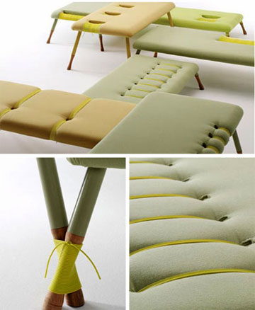 這款帶軟墊的階梯型長椅出自丹麥設(shè)計(jì)師Ditte Hammerstrom之手??雌饋硐裆窖蚰_一樣的長椅腳被繩索裝套起來,繩子和椅面的顏色也不落俗套。