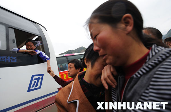 3月27日,在青川縣關(guān)莊鎮(zhèn)寺壩板房區(qū),4歲的小芳與親屬淚別。