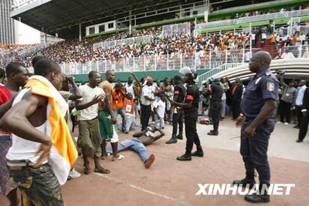 據(jù)BBC駐象牙海岸記者約翰-詹姆斯發(fā)回的消息,這場(chǎng)比賽大約有36000名球迷涌入球場(chǎng)(有媒體提供數(shù)據(jù)是50000名)。據(jù)報(bào)道,比賽結(jié)束后,球迷推倒了體育場(chǎng)內(nèi)的一面墻體,為了控制場(chǎng)內(nèi)情緒激奮的人群,可能是警察使用了催淚瓦斯,但加劇了人們的恐慌,最終造成了19人死亡的慘劇,另外還致使132人受傷。