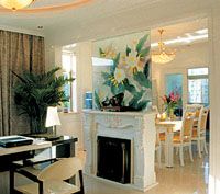 本案客廳的色彩運(yùn)用了明黃色,并配以白色的頂角和踢角。而地中海式風(fēng)格的壁爐處于主角位置。百安居裝潢中心的設(shè)計(jì)師徐冬萍稱,原先想把壁爐和電視柜結(jié)合在一起。并為此設(shè)計(jì)了多種樣式,但總覺(jué)得古典的壁爐和現(xiàn)代的電器融合在一起不是很合適。最后,才把電視柜單拿一邊。這樣帶有巴洛克樣式的白色大理石壁爐成為最終選擇。但是4.2米挑高的客廳光放一個(gè)壁爐是很顯單薄的,于是,把壁爐后的整面墻做突出,并在上面用了塊極漂亮又有吉祥意義的孔雀圖案與壁爐一起相互輝映。然后考慮的體量關(guān)系,兩邊再點(diǎn)綴上銅制的壁燈。