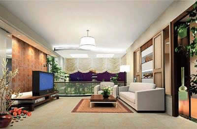 欣賞方案四時,不禁贊嘆設計者在色彩搭配上的用心。紫色從來都是令人又愛又恨的顏色,大面積使用會讓人產(chǎn)生壓抑感,而小面積使用時,它的獨特個性又讓人在色彩搭配上煩惱不已。此方案為我們提供了一個很好的范例。大面積的明黃色,抹上些許的金黃,點綴幾片深紫,一個華麗而高雅的客廳就這樣設計出來。