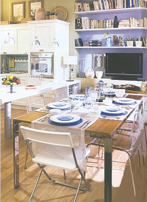 在這35平方米空間里可說(shuō)是五臟俱全。一張餐桌、六把餐椅,占據(jù)了客廳的所有活動(dòng)空間,但有了可伸縮的餐桌,在不聚餐的時(shí)候,客廳里的活動(dòng)空間可被完整地還原。金屬結(jié)構(gòu)、橡木臺(tái)面的餐桌搭配半透明水晶外殼的椅子,布置出簡(jiǎn)潔的就餐領(lǐng)地。準(zhǔn)備若干把可折疊的椅子是必要,方便就餐客人人數(shù)的增減。白色的桌布、藍(lán)白兩色的餐具干凈清爽??臻g雖小,與朋友相聚的快樂(lè)卻一點(diǎn)都不會(huì)減少。