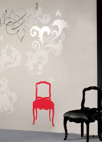 具象的椅子和抽象的花朵共同出現,反映出混搭風潮對壁紙設計的影響。