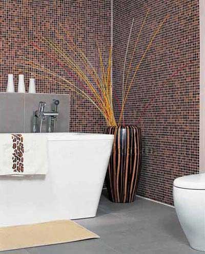 棕色給人一種沉穩(wěn)、高貴之感,大面積的棕色馬賽克和造型硬朗的浴具搭配,營(yíng)造出平穩(wěn)卻不乏生動(dòng)的空間。以下面的例子為榜樣,現(xiàn)在就拆解棕調(diào)衛(wèi)浴的打造招數(shù)!勿忘的點(diǎn)睛之筆——方便美觀的裝飾品:在整體氣氛盈滿的空間里,偶爾有角落里的一點(diǎn)亮色突然點(diǎn)亮了整個(gè)空間。純白色的衛(wèi)浴用品與大體量木制大花瓶的古舊氣息,在此發(fā)揮了這種營(yíng)造“低調(diào)”浪漫的奇妙效果。