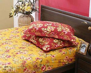 黃色為底床罩+紅色花朵靠枕 一幅田園氣息在臥室洋溢。以一種恬淡陶然的田園情懷再現精致浪漫的都市品質生活:聞著空氣中彌漫著愛的氣息,那一份溫馨,那一份感動,盡在這一瞬間??臻g,因為得到釋放而精彩紛呈。