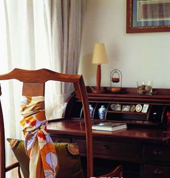 角落的書桌安靜私密,古典書桌與座椅,搭配真絲絲巾與錦緞靠墊,顯示出女主人在細微之處的自我關(guān)懷。