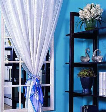 天鵝與湖藍色的墻面,制造了具有童話意味的夢幻角落。藍色絲巾挽住潔白的窗簾,搭配出女性的精神力量。