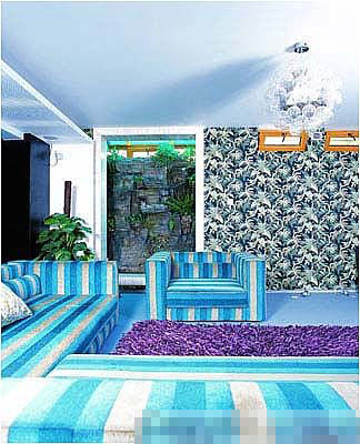 打開聽覺、視覺,一切感觀。自然的采光景觀和綠色墻紙?zhí)羝鹨晃莸那逖拧I罨宜{(lán)地面、條紋沙發(fā)支起一墻攀滕。