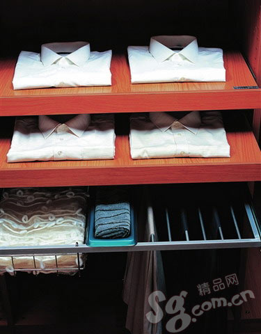 由不同規(guī)格的木板與連接五金件拼裝而成,比木榫連接更牢固。旋轉(zhuǎn)衣架、下拉式掛桿、各種功能性拉籃在此大顯身手,所有服飾都能在其中找到自己合適的“家”。
