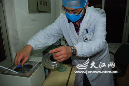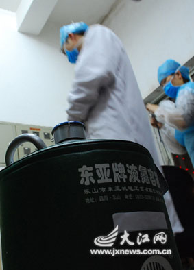 這邊在注射麻藥,那邊醫(yī)生在另外一間屋內(nèi)進行取精。負責取精的醫(yī)生唐海勛告訴記者,**開始是冷藏于-196℃的液氮罐里;之后,取出放入水溫36℃的水浴箱,進行平衡溫度并且保濕;再在分離器里將活**與死**分離,將活**聚集收集;再對其進行洗滌、激活。至此,完成取精過程。