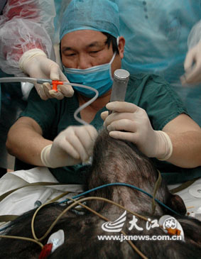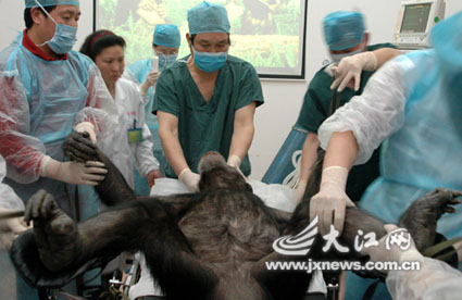 昌大一附醫(yī)院副院長王共先告訴記者,由于黑猩猩與人的構(gòu)造不一樣,給手術(shù)帶來了一定的麻煩。如插入輸精管時,剛一**去,卻發(fā)現(xiàn)不對,是尿道,不是**;還有,輸精管開始是按人用的長度標準使用的,后來發(fā)現(xiàn)短了。不過,這些小麻煩都被一一解決了。