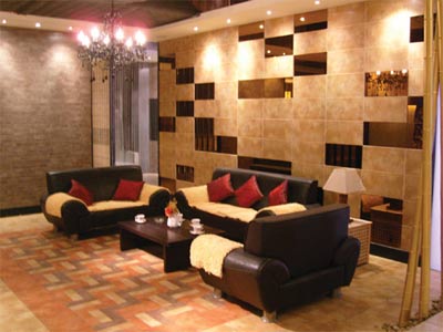 客廳的輪廓以斜插竹桿、磚體屏風(fēng)劃分,豪華的歐式吊燈與熱情洋溢的“威尼斯春天”系列地磚上下呼應(yīng),真皮沙發(fā)套裝,硬木茶幾,墻面是由墻壁上凹凸混鋪的瓷磚和茶色的反光鏡片巧妙的穿插。整個(gè)客廳活潑而不炫亂,更顯現(xiàn)代風(fēng)尚,無(wú)論新朋舊友皆可由衷感受到主人的熱情好客與雍容大方。
